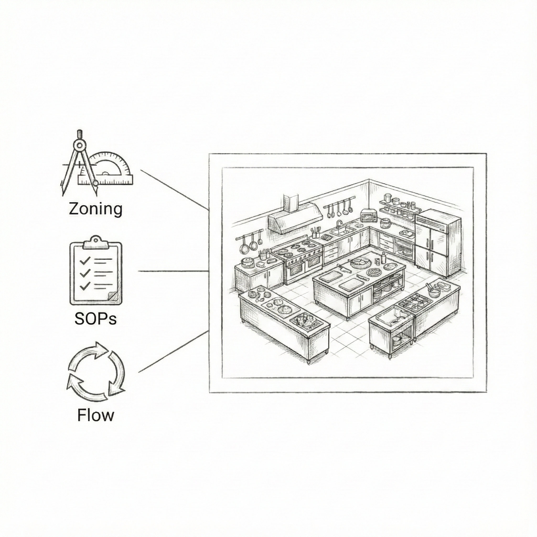 Kitchen zoning and SOPs that turn chaos into effortless consistency.